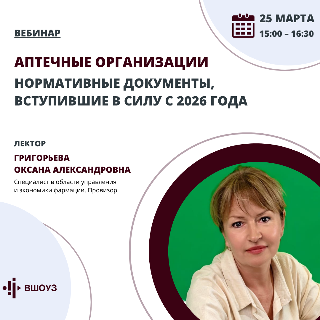 25 марта 2026 г. в 15:00 приглашаем на вебинар "Аптечные организации. Нормативные документы, вступившие в силу с 2026 года". Григорьева Оксана Александровна, Специалист в области управления и экономики фармации. Провизор. В процессе лекции слушатели ознакомятся с основными правовыми изменениями в фармацевтической сфере в начале 2026 года, включая требования по типовым программам по профессиональному обучению; требования к образовательным организациям, осуществляющим фармацевтическое образование, в том числе дополнительное; изменения в правилах регистрации ЛП; балльную систему оценки уровня локализации производства ЛС.