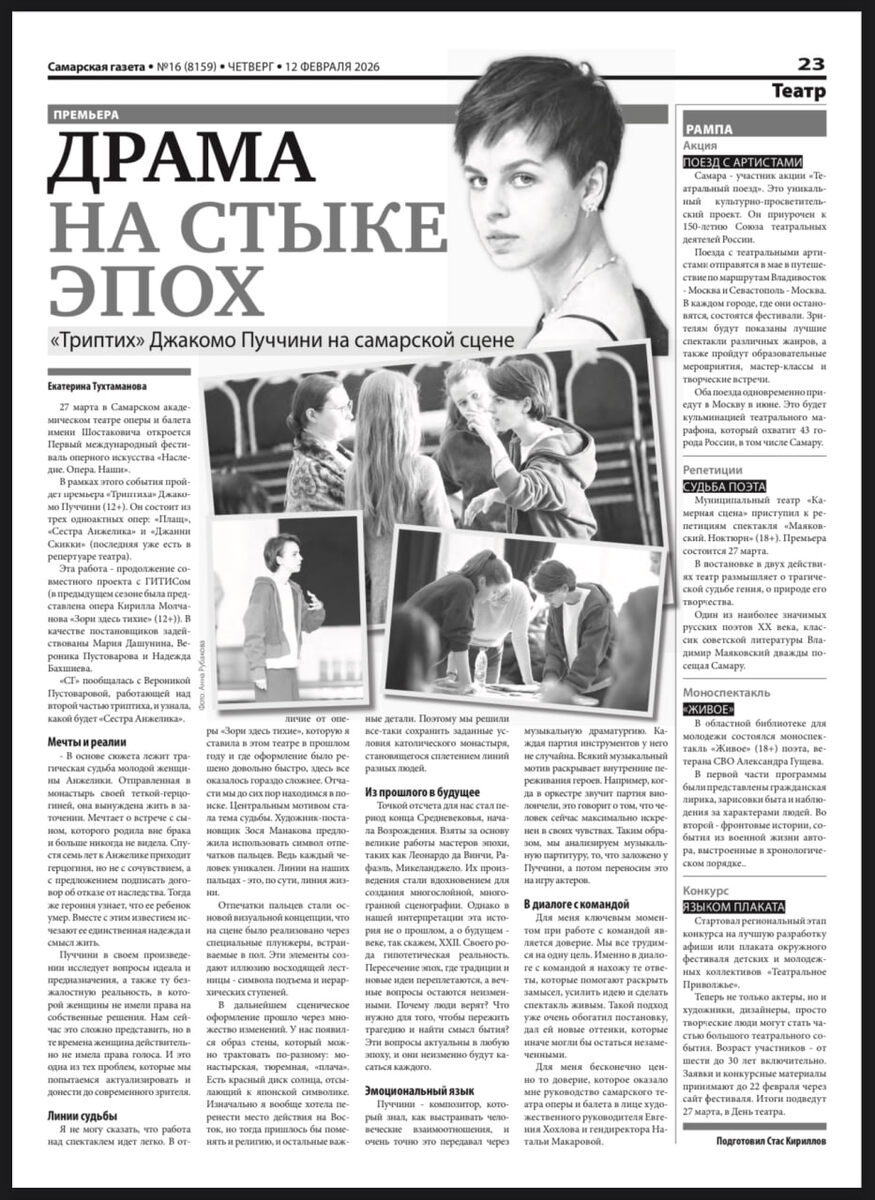 Опера» Готовимся к премьере! Дж. Пуччини «Триптих» «Пуччини – композитор, который точно знал, как выстраивать человеческие взаимоотношения и очень точно это передавал через музыкальную драматургию. Каждая партия инструментов у него не случайна, каждый музыкальный мотив раскрывает внутренние переживания героев. Например, когда в оркестре звучит партия виолончели, это говорит о том, что человек сейчас максимально искренен в своих чувствах», - о том, какой будет постановка в интервью «Самарской газете» рассказывает режиссёр-постановщик оперы «Сестра Анжелика» (второй части триптиха) Вероника Пустоварова. Подробнее читайте в выпуске Самарской газеты (страница 23)! Исполнители: солисты и артисты Шостакович Опера Балет Музыкальный руководитель и дирижёр-постановщик – Евгений Хохлов Художник-постановщик – Зося Манакова Художник по костюмам – Анастасия Сокольвак Художник по свету – Антон Секачёв Билеты онлайн по ссылке. Идеолог и художественный руководитель фестиваля - Евгений Хохлов 12