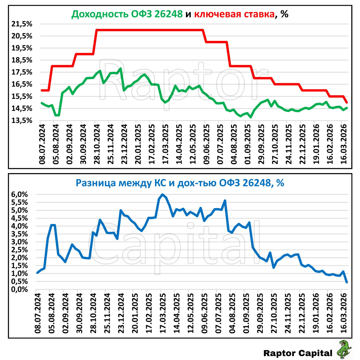 📌 Сегодня предлагаю взглянуть на рынок ОФЗ и выяснить, выгодно ли сейчас их покупать с учётом траектории ключевой ставки. • Сделал два графика, на верхнем динамика доходности ОФЗ 26248 и ключевой ставки, на нижнем графике спред (разница) между этими двумя показателями. • Сейчас спред достиг своего минимума с момента размещения выпуска 26248, всего около 0,5%. Выпуск $SU26248RMFS3 предлагает зафиксировать доходность к погашению 14,5%, что всего на полпроцента ниже ключевой ставки. • У новых дальних выпусков ОФЗ спреды ещё ниже: — 26250 – 0,32% ($SU26250RMFS9);