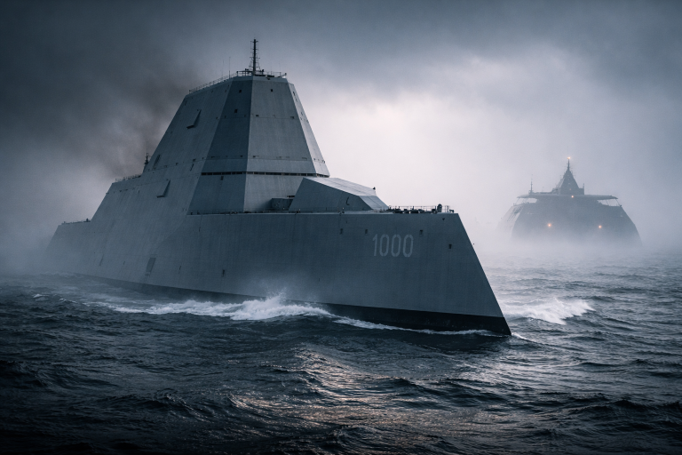Слишком… неправильные. И тем не менее — их строили. Не на бумаге, не в фантазиях инженеров, а в металле. Спускали на воду. Испытывали. Иногда — даже принимали на вооружение. Потому что море, как ни странно, любит эксперименты. Долгое время корабли старались делать заметными. Высокие борта, надстройки, мачты — всё это было частью силы и присутствия. Но с появлением радаров логика изменилась. В какой-то момент инженеры задались вопросом: а что если корабль должен не пугать — а исчезать? Так появляются формы, которые больше напоминают фантастику, чем флот. Американский эсминец USS Zumwalt выглядит так, будто его нарисовали для фильма про будущее. Наклонённые внутрь борта, угловатые поверхности, минимум выступающих деталей. Всё ради одного — отражать радиоволны так, чтобы корабль «терялся» на экрана