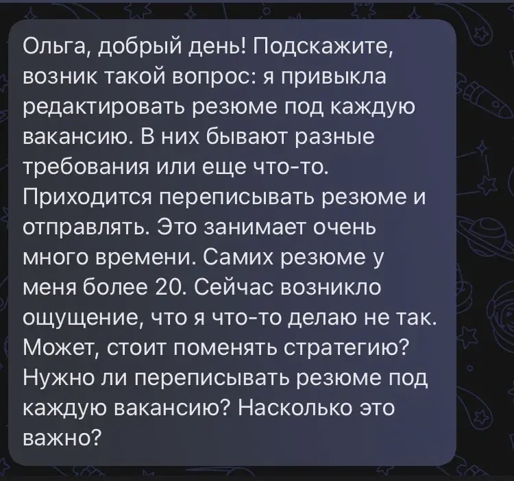 Если есть ощущение, что что-то идёт не так, но непонятно что именно — приходите на бесплатную консультацию. Запись по ссылке https://idealnoerezume.ru/freecon Разберём вашу ситуацию, найдём слабые места и определим, что мешает вам получать офферы.