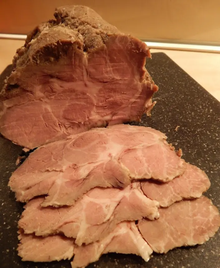 Очень нежное, пряное и мягкое мясо для нарезок. Не пересушенное и не переваренное. Все дело в правильном приготовлении. А точнее в его минимуме. - свиная шея - 1 кг - вода - 2 литра - соль - 1/3 стакана - сахар - 1 столовая ложка - черный перец горошком - 1/2 чайной ложки - чеснок - 6 зубчиков - луковица - 1 шт. - можжевельник, душистый перец - несколько зерен - лавровый лист - 6 штук - майоран - 1 чайная ложка Моем мясо. Есть куча мнений, что мясо мыть нельзя, но все же у нас принято мыть и затем обсушивать салфетками. Срезаем с куска все некрасивое и лишнее. Дальше в большую кастрюлю налейте воду и добавьте все специи, лук, соль и сахар. Доведите рассол до кипения. Дайте ему остыть, затем положите сырую свиную шею в холодную воду. Верните кастрюлю на огонь и варите рассол с мясом 5 минут (с момента закипания). Выключите. Дайте остыть, затем оставьте мясо в рассоле на ночь в холодильнике или на балконе (если холодно). На следующий день повторите процесс приготовления в течение 5 мину
