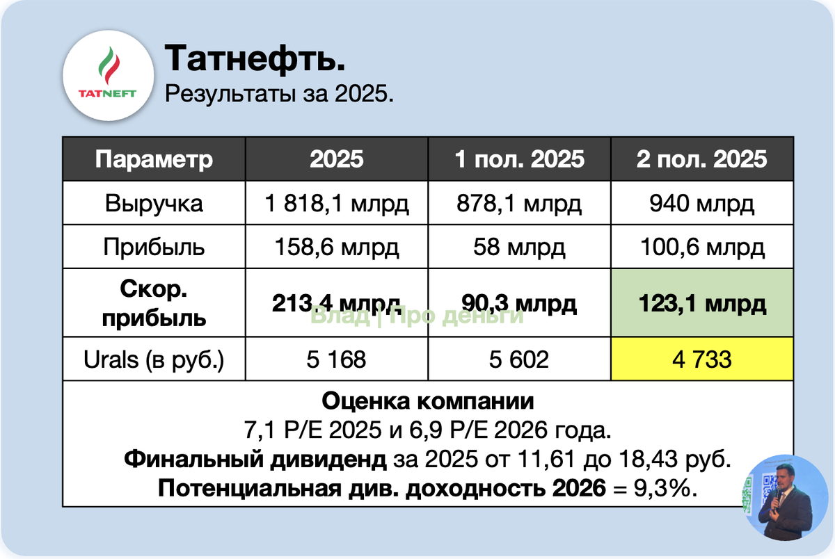 Отчет Татнефти за 2025 был сильнее моих ожиданий. Рассказываю, почему, и чего ждать от 2026 года. ❌ Прибыль 2025 = 158,6 млрд руб. (в 2024 = 306,1 млрд руб.) При этом, прибыль занизили целый ряд разовых факторов — убытки от обесценения в 27,8 млрд руб., потери на курсовых разницах в 25,1 млрд руб., эффективная ставка налога на прибыль в 31,5%. Я корректирую прибыль Татнефти на эти факторы. ❌✔️ Скор. прибыль 2025 = 213,4 млрд руб. (в 2024 = 322 млрд руб.) 1 пол. 2025 = 90,3 млрд руб. 2 пол. 2025 = 123 млрд руб. Для меня стало удивлением, что Татнефть заработала больше во 2-м полугодии 2025 года, чем в 1-м, потому что цена Urals в рублях в 1-м полугодии была 5 602 руб. против 4 733 руб. во 2-м полугодии. Нюанс тут в том, что Татнефть перерабатывает 60%+ своей добываемой нефти на НПЗ Танеко в светлые нефтепродукты. Поэтому тут важна не только цена нефти, но и крек-спреды (т.е. разница между ценой нефти и нефтепродуктов). И вот в 3-4 кварталах крек-спреды были выше, чем в 1 и 2 кв., отсюда