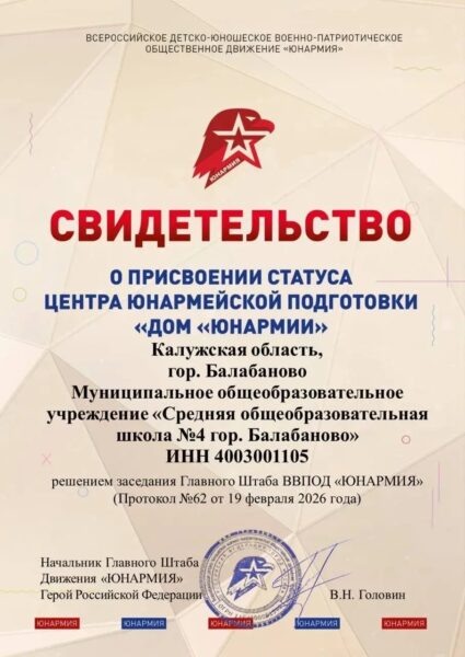 В районе появился уже третий центр детского патриотического воспитания. Подробнее об этом рассказал глава Боровского округа Николай Калиничев. Торжественное открытие «дома «Юнармии» прошло в балабановской школе № 4. Проект воплотили в жизнь благодаря работе коллектива учебного заведения и руководителя Надежды Расческовой. На новой площадке смогут обучаться: отряд «Юные жуковцы», казачий отряд им. Матвея Платова и объединение «Юные танкисты» им. Д. Маслова. «Пусть новый «Дом «ЮНАРМИИ» станет местом притяжения сильных и добрых сердец. Своими успехами вы доказываете, что будущее нашей страны — в надёжных руках», – поздравляет юных патриотов Николай Калиничев. Георгий Афончиков / Калуга Сегодня , Фото со страницы Николая Калиничева