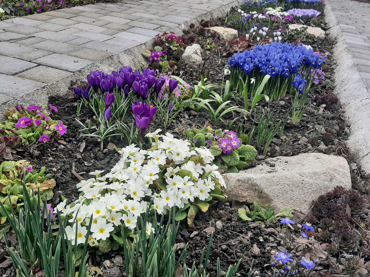 Продолжаем наше совместное шествие вдоль моей межколесной дорожки первоцветов от навеса к воротам. Вторая группа разросшегося иридодиктума Harmony остаётся позади, а за ней приютились уже доцветающие галантусы с зелёными листьями, которые мы месяц назад пытались опознать. В прошлом году цветов не было, в этом были три штуки, но одним пришлось пожертвовать ради сравнительных фотографии, остаётся только надеяться на обильное цветение в будущем. Здесь же, рядышком, второй год растут крошечные крокусы Spring Beauty. Симпатичные малыши, когда полностью раскрываются, но мне они очень нравятся в полузакрытом состоянии, тёмные полоски очень эффектно смотрятся. На фото выше видно насколько они меньше крупноцветковых крокусов. Эти крупноцветковые у меня самые большие по размеру цветка, имя неизвестно, когда-то выбирала из шоубокса в магазине. Могу предположить, что это Flower Record. Сегодня припекает солнце, боюсь очень быстро они отцветут из-за этого. Дальше, возле камня, не очень стройная гру
