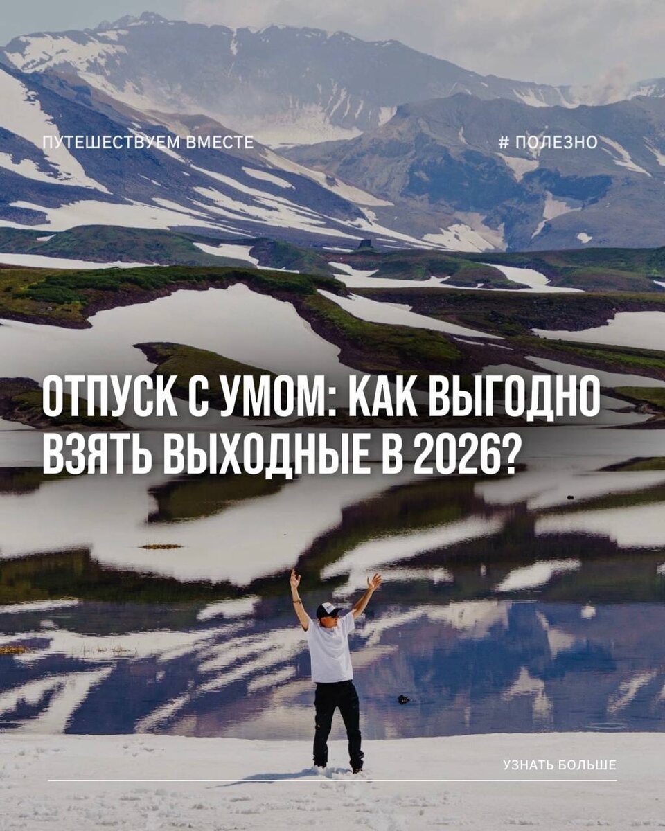 ? 🗓 📌 Сохраняйте шпаргалку, чтобы отдыхать дольше и тратить меньше отпускных дней. По ТК РФ праздничные дни в отпуск не входят, поэтому можно удачно совместить отпуск с выходными и получить больше дней отдыха. Самые выгодные периоды в 2026 году: ➡️ Майские праздники Берите отпуск 4–8 мая и получите 11 дней отдыха, потратив только 5 дней отпуска. ➡️ День России Отпуск 15–19 июня даст вам 10 дней отдыха с учетом праздничных и выходных. ➡️ День народного единства Если взять отпуск 5–6 ноября, можно отдыхать 5 дней, потратив всего 2 дня отпуска. ➡️ Конец года Один из самых выгодных вариантов: отпуск 28–30 декабря = 16 дней отдыха вместе с новогодними выходными. Берите на заметку и отправляйте близким. А чтобы отпуск был не только длинным, но и запоминающимся, посмотрите наши направления путешествий по ссылке. 😀Напишите нашему менеджеру — оперативно разработаем для вас программу тура и реализуем маршрут в любые удобные даты. 😀 Подписаться на канал 💬 Подписаться на нас в ВК