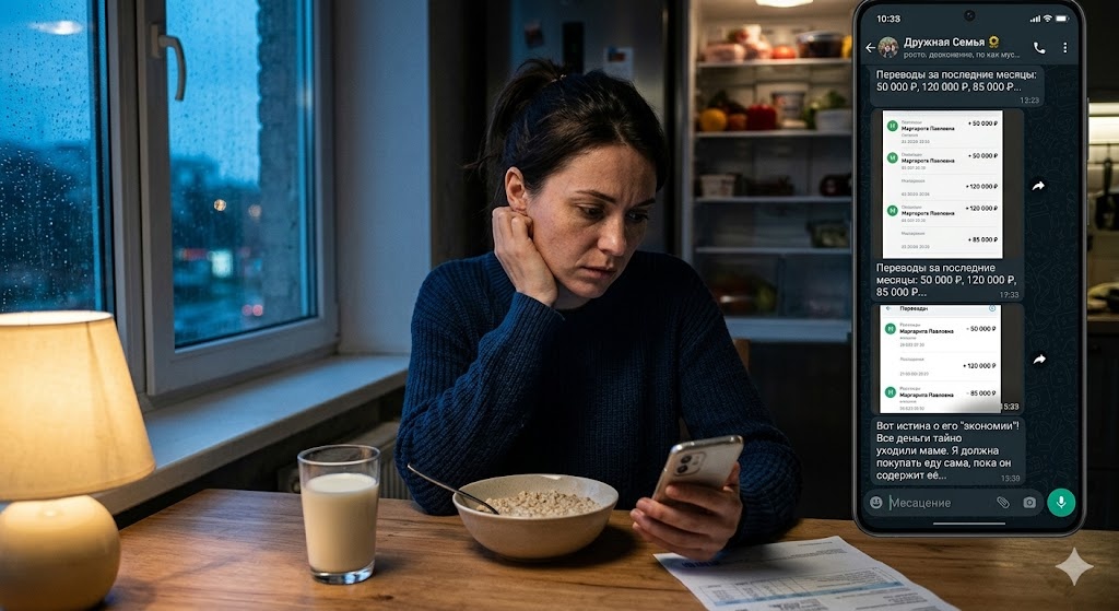 Елена (09:27): «Доброе утро, "дружная семья". Маргарита Павловна, я очень сочувствую вашей текущей крыше, но, судя по выпискам со счета вашего сына, на те полмиллиона рублей, что он перевел вам в тайне от меня только за последние полгода, можно было не только крышу починить, но и выстроить новый дом. Катя, отвечаю на твой вопрос: мы не скинемся матери на юбилей. Потому что мой муж перевел нас на "раздельный бюджет". Вчера он заявил, что я должна покупать себе продукты сама, так как он "не обязан спонсировать мои изыски". Теперь я понимаю, почему ему не хватает на еду для жены. Тяжело тянуть "нищую" пенсионерку, которая каждый сезон ездит в санатории премиум-класса на деньги из нашего семейного бюджета, отложенные на квартиру.
