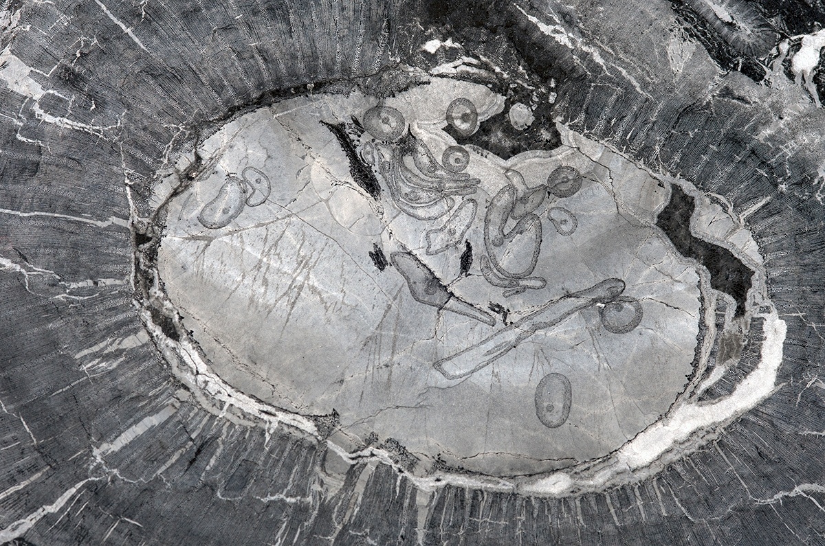 Поперечный срез окаменелых стеблей каламитов рода Arthropytes и Calamitea из палеозойских осадочных отложений, обнаруженных в Восточном Донбассе Ростовской области. Около 320 миллионов лет назад, в среднем карбоне, эта территория находилась в тропической зоне и являлась частью Еврамерийской палеофлористической области. В эту область входили Северная Америка, Европа, Малая и Средняя Азия, а также Северная Африка. Палеозойские тропические леса Еврамерийской палеофлористической области (также известной как вестфальская флора) состояли в основном из гигантских споровых: плауновидных растений (лепидодендронов, сигиллярий и др.), а также хвощевидных (каламиты, клинолистовые и др.), которые были распространены в долинах рек и болот.