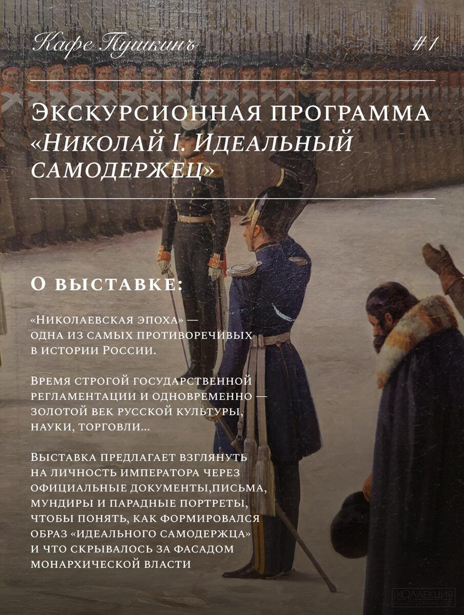 Идеальный самодержец» в Государственном историческом музее. «К себе самому император Николай I был в высшей степени строг, вёл жизнь самую воздержанную, ел всегда мало, большей частью овощи, ничего не пил, кроме воды, разве иногда рюмку вина, никогда не курил, но и не любил, чтобы другие курили. Прохаживался два раза в день пешком обязательно — рано утром перед завтраком и занятиями и после обеда, днём никогда не отдыхал». – Баронесса Мария Фредерикc Таким он запомнился современникам — дисциплинированным, но при этом способным оценить гоголевский талант вопреки цензурному ведомству. А каким предстанет Николай I перед вами, разберемся в эту субботу. В программе экскурсии: завтрак в зале «Библиотека» с двумя горячими блюдами на выбор, трансфер до музея и экскурсия по экспозиции. Купить билеты можно на сайте ресторана «Кафе Пушкинъ»