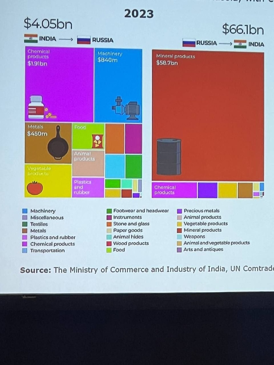 ?» 📦🤝 Разбираем товарные потоки между Россией и Индией Простыми словами: у нас есть то, что нужно им. У них есть то, что нужно нам 🇷🇺 Россия в Индию поставляет: · Удобрения 🌾 · Нефть и газ ⛽️ · Агропродукцию и мясо 🥩 🇮🇳 Индия в Россию поставляет: · Текстиль 👕 · Электронику 💻 · Оборудование 🏭 · Фармацевтику 💊 600 000 человек индийского среднего класса — это огромный потребительский рынок. И он растет. Для российского экспорта это окно возможностей, которое нельзя упускать На пленарной сессии #RUSIND26 эксперты говорили о том, как наращивать и диверсифицировать товарооборот. Индия — третий по величине торговый партнер ЕАЭС. Идут переговоры о зоне свободной торговли ‼️Пять перспективных сфер: образование, туризм, телекоммуникации, кораблестроение, критические минералы. 🎓✈️📡🚢⛏️ #Торговля #Экспорт #Импорт #РоссияИндия #Товарооборот #ЕАЭС #Экономика