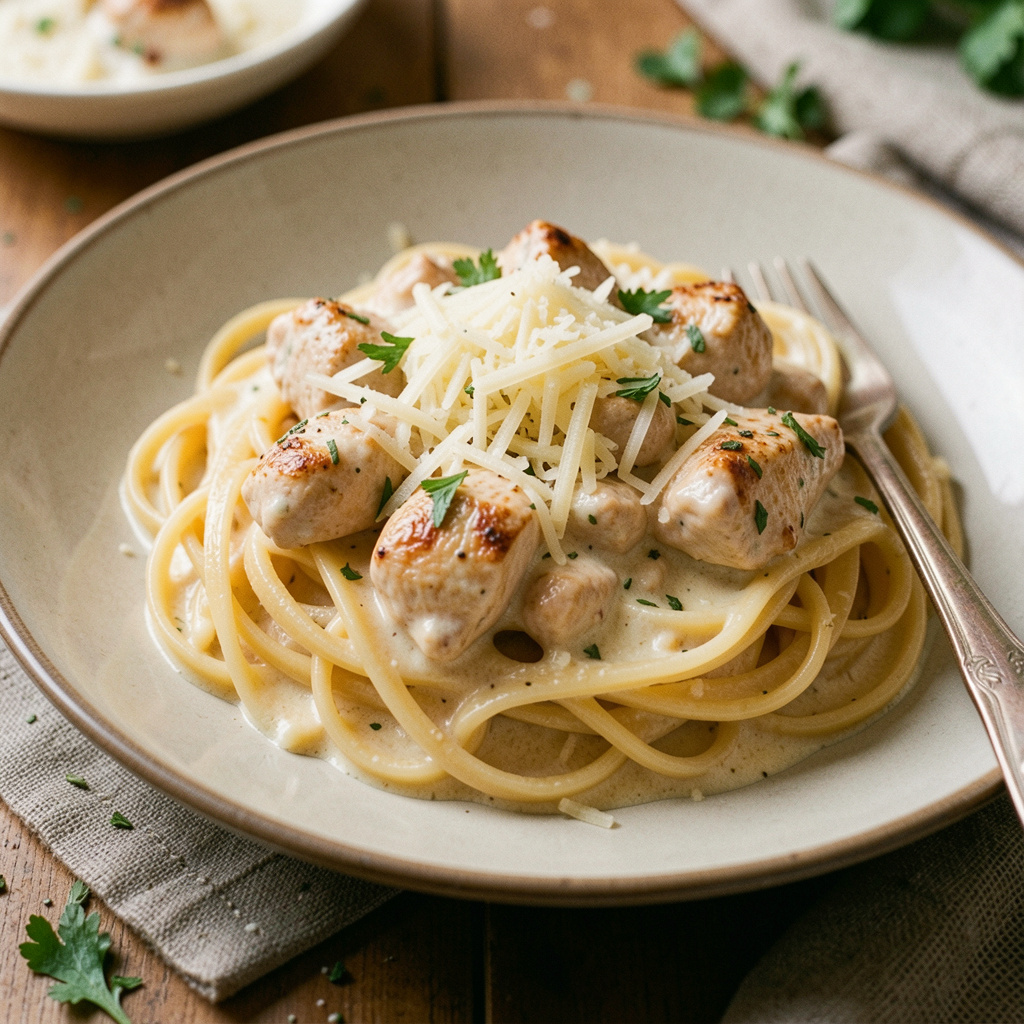 Есть блюда, которые не требуют повода. Паста с курицей в сливочном соусе — именно такое. Она сытная, ароматная, готовится примерно за 30 минут и при этом выглядит так, словно вы провели у плиты весь вечер. Это идеальный выбор для буднего ужина, когда хочется чего-то настоящего, а не просто «чтобы поесть». Основа: Соус: Специи и зелень: Начните с того, что подготовьте всё заранее — это сделает процесс готовки плавным и без суеты. Куриное филе промойте под холодной водой и обсушите бумажным полотенцем. Нарежьте его небольшими кусочками размером примерно 2×2 см — так оно прожарится равномерно и быстро. Посолите, поперчите и добавьте паприку, перемешайте и оставьте мариноваться буквально на 5–7 минут прямо на разделочной доске. Лук очистите и нарежьте мелким кубиком. Чеснок раздавите плоской стороной ножа и мелко порубите. Пармезан натрите на мелкой тёрке. Петрушку крупно порубите. Поставьте большую кастрюлю с водой на сильный огонь. На каждые 100 г пасты нужно примерно 1 литр воды. Когда
