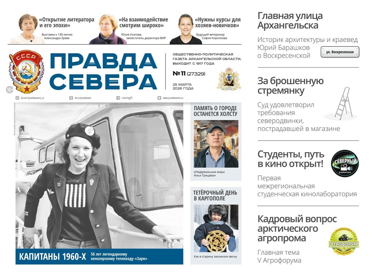 В новом выпуске газеты мы традиционно подводим итоги минувшей недели и делимся самыми яркими и запоминающимися событиями Архангельской области. На первой полосе — поздравление губернатора Александра Цыбульского с Днём работника культуры. Глава региона подчёркивает: в Год культуры Русского Севера Поморье станет площадкой для масштабных событий — 880-летия Каргополя, 90-летия со дня рождения Николая Рубцова и 100-летия Северного хора. В рубрике «Открытая власть» глава региона рассказывает о поддержке участников СВО, старте грантового конкурса «Вместе мы сильнее» и победах шести музеев региона в программе «Музей без границ». Главная краеведческая тема номера — рубрика на 6-й странице, где историк архитектуры Юрий Барашков продолжает знакомить читателей с главными улицами Архангельска. На этот раз — Воскресенская, которая когда-то называлась улицей Энгельса. Автор рассказывает, как железнодорожный вокзал на Мхах определил судьбу этой магистрали, и сожалеет, что дворовый фасад Гостиных двор