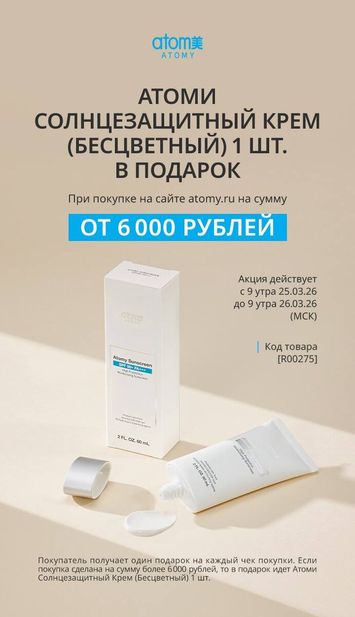 Покупатель получает один подарок на каждый чек покупки Атоми Солнцезащитный Крем (Бесцветный) 1 шт. в подарок при покупке от 6000 руб на сайте Атоми Россия 📌Акция действует с 9:00 25.03.26 - 9:00 26.03.26 (по московскому времени)