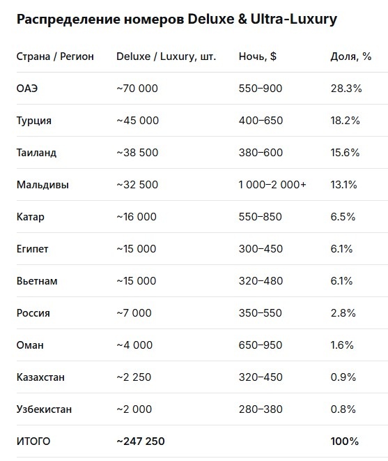 Цифры по премиальному сегменту в этом году сильно отличается от привычных. Ближний Восток (ОАЭ, Катар, Оман) — это 36.4% всего люксового номерного фонда в выборке. И именно этот объем сейчас частично «выпадает» из привычного потока. В результате происходит неочевидный, но важный сдвиг: тысячи туристов, которые раньше стабильно отдыхали в этом регионе, перераспределяются в другие направления. При этом, например, в Турции из 280 тыс. номеров в «пятерках» только около 45 тыс. — это действительно премиальный уровень. Остальное — массовый All Inclusive.
