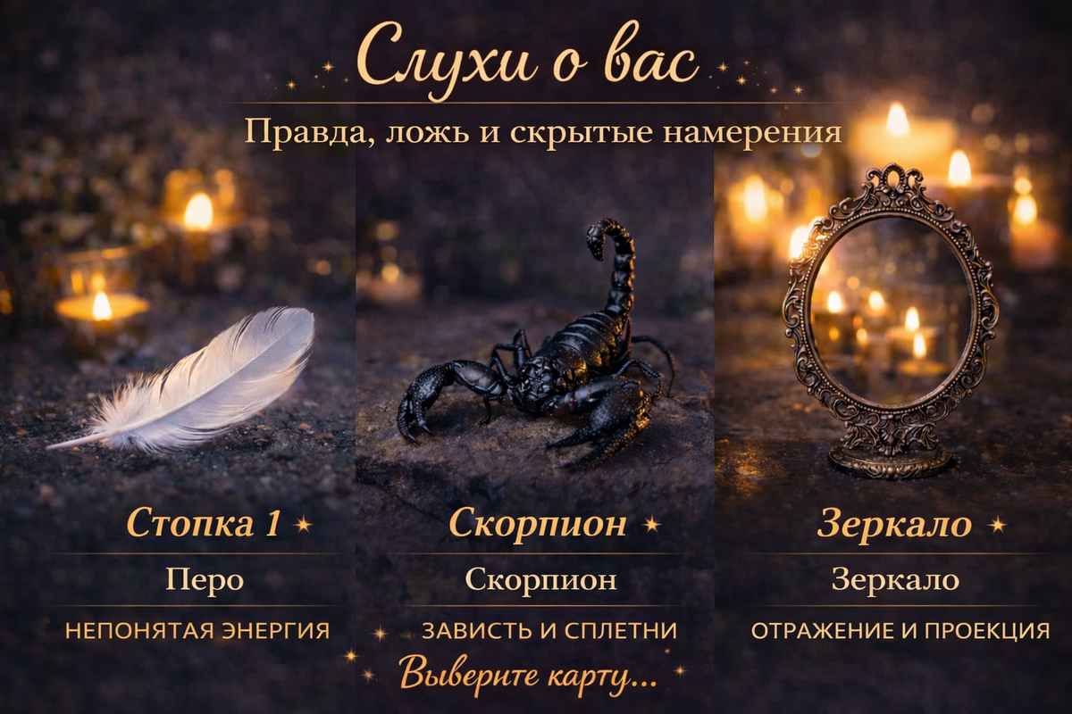 Сделайте вдох... доверьтесь своей интуиции... и выберите Стопку: Слухи о Вас здесь - это искаженные версии правды. Что-то из того, что Вы сказали или сделали, было вырвано из контекста и пошло дальше уже без ясности и смысла. Что говорят люди: Вы стали "отстраненной" или "изменились". Вам уже не так важно то, что раньше было важно. Вы стали избирательнее в людях. Правда: Вы не стали холодной - Вы просто научились границам. Тем, кому была удобна Ваша прежняя версия, неуютно рядом с Вашим ростом. Скрытое намерение: Некоторые люди проецируют на Вас собственную неуверенность, потому что у них больше нет к Вам прежнего доступа. Послание: Пусть говорят. Ваш покой важнее, чем бесконечные попытки исправить каждое чужое недоразумение. Эта Стопка ощущается тяжелее. Слухи здесь намеренные, и исходят они от человека, которого Вы задеваете самим фактом своего присутствия. Что говорят люди: Ставят под сомнение Ваш характер или мотивы. Переворачивают Ваши поступки так, чтобы они выглядели чем-то пло