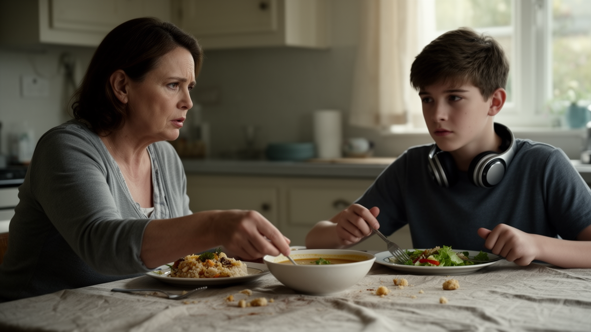Сели за стол. Сначала всё было нормально. Я разливала суп, мама попросила хлеб, муж посолил, сын ел молча. Я спросила, как у него в школе. Он ответил: