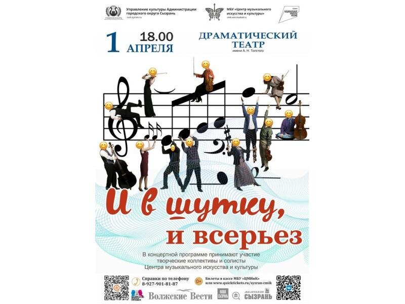 Центр музыкального искусства и культуры приглашает жителей Сызрани на уникальное музыкальное событие - концертную программу «И в шутку, и всерьёз», где классическая и современная музыка, шутки и юмор сольются в единое целое. В исполнении творческих коллективов и солистов муниципального оркестра Сызрани прозвучат зажигательные, искрометные и бесконечно красивые произведения популярной и современной классики, а также неожиданные дуэты, забавные пародии на известные хиты, шуточные интермедии, которые заставят зрителей улыбнуться или смеяться до слёз. А ведущие концерта расскажут интересные факты из истории праздника 1 апреля, поведают, как шутят и разыгрывают друг друга в этот день жители разных стран, а еще расскажут о том, как известные композиторы мастерски прятали шутки в своих нотах, искали забавные тембры классических инструментов и создавали музыкальные шаржи. В программе концерта: И. С. Бах «Шутка», И. Штраус «Галоп со вздохами», «Марш Радецкого», Э. Григ «В пещере горного короля»