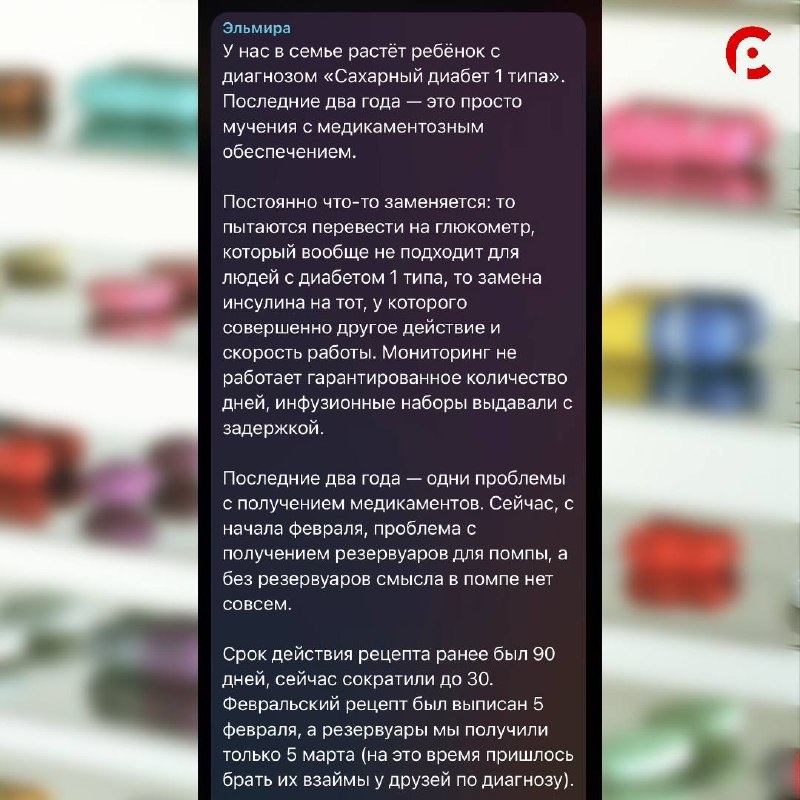 В чат губернатора области написала мать ребенка, болеющего сахарным диабетом 1 типа. По её словам, последние два года обеспечение необходимыми препаратами превратилось в мучение. Постоянно что-то заменяется: то пытаются перевести на глюкометр, который вообще не подходит для людей с диабетом 1 типа, то меняют инсулин на тот, у которого совершенно другое действие и скорость работы. Мониторинг не работает гарантированное количество дней, инфузионные наборы выдавали с задержкой, — отмечает вологжанка. С февраля, по её словам, тяжело получить резервуары для инсулиновой помпы. Рецепт от 5 февраля женщина смогла реализовать только через месяц — на это время резервуары брала взаймы у знакомых. При этом, когда вологжанка позвонила в аптеку, специалисты сообщили женщине, что сосуды сейчас получить нельзя. Позвонила на горячую линию уточнить, когда они будут, но в ответ узнала, что мы «оказываемся обеспечены» резервуарами аж до 5 апреля... А кто обеспечил? Мы их взяли взаймы и нужно ещё их вер