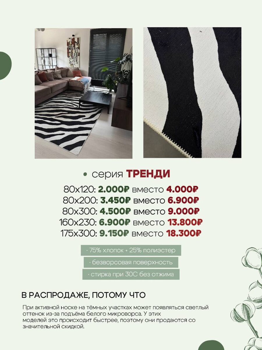 %❗️ Ковровые Магнаты, у нас распродажа ковров со скидкой до 50% 💚 Ковров не так много, так что успевайте! 🙌🏻 На что скидка: — Ковры с небольшими дефектами (уюта и тепла в них не меньше 🤭) — Расцветки, которые мы выводим из ассортимента И кстати: у тех, которые выходят из ассортимента, качество отличное. С ними всё хорошо, просто мы обновляем коллекцию. Так что это вообще идеальный вариант, чтобы купить ковёр! Пишите нам в личные сообщения для заказа 🚩 ‼️Будьте внимательны, мы связываемся только с этого аккаунта - https://t.me/Ecolaresspb‼️