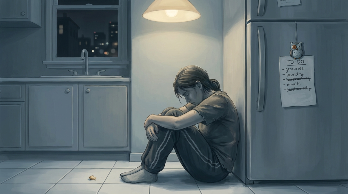 Она опустилась на пол. Медленно. Спиной к холодильнику. Ноги подтянула к себе, обхватила руками колени. Сидела и смотрела на плитку. Белая, холодная, где-то в углу крошка от хлеба.
