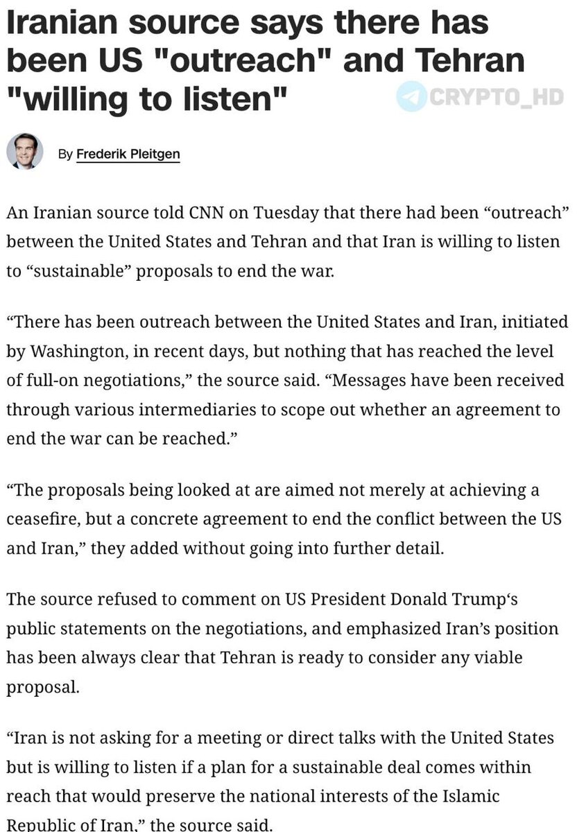 🇮🇷🇺🇸 Иран готов рассмотреть предложения США. Иранский источник сообщил CNN, что в последние дни по инициативе США велись косвенные контакты между Вашингтоном и Тегераном. Речь пока не идет о полноценных переговорах, но стороны через посредников обсуждают возможность соглашения о завершении конфликта. Рассматриваются не только варианты прекращения огня, но и более широкая сделка, которая могла бы окончательно урегулировать противостояние. Иран готов изучить «устойчивые» предложения, если они будут учитывать национальные интересы. Правительство Ирана также заявило о готовности предоставить гарантии отказа от разработки ядерного оружия при сохранении права на мирный атом. Обязательное условие – полная отмена санкций. Ранее: - заявление Трампа - 5 дней на переговоры - Иран все отрицает Crypto Headlines