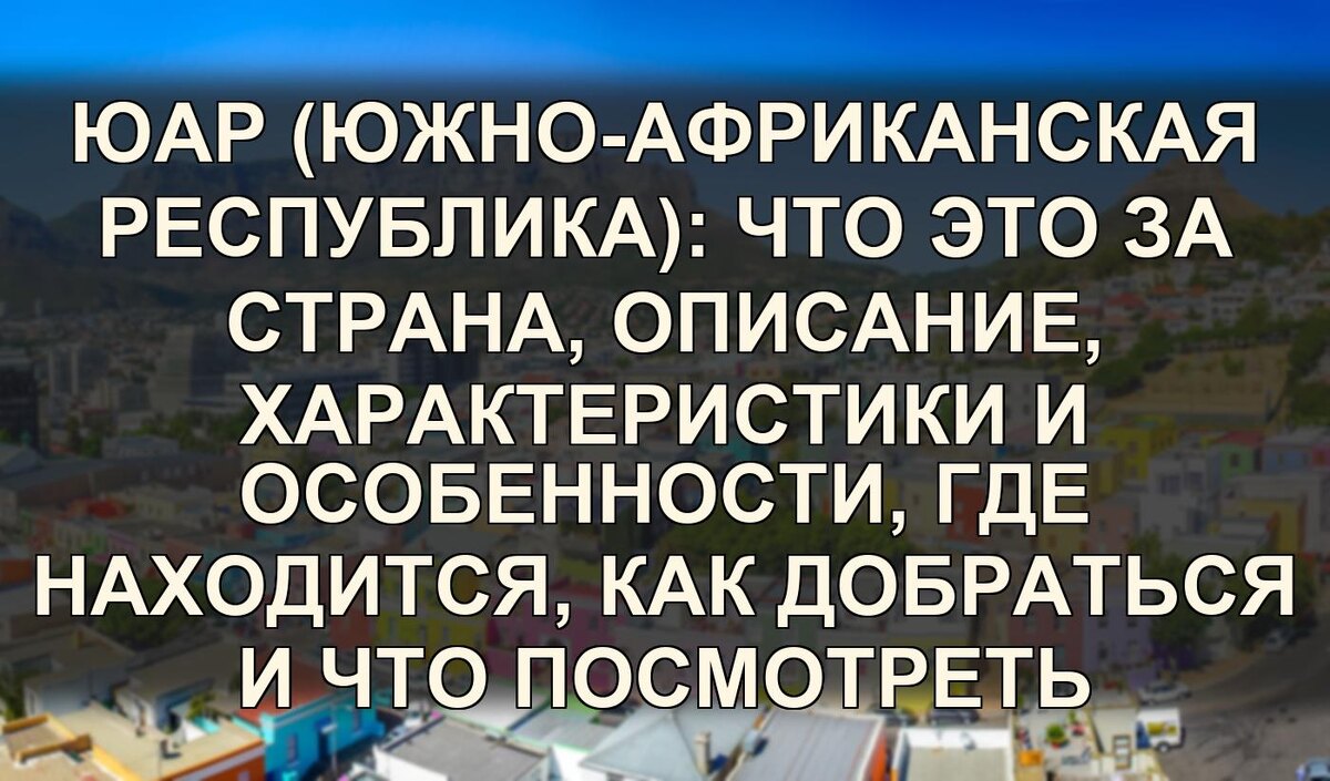Южно-Африканская Республика (ЮАР) — страна, расположенная на самом юге африканского континента. Она граничит с Атлантическим и Индийским океаном, а также имеет общие границы сNamibia, Botswana и Zimbabwe.