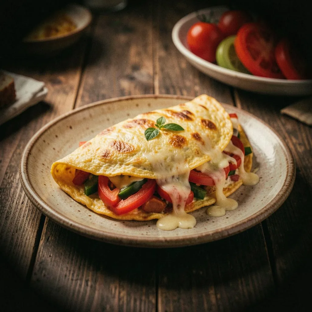 Омлет с овощами и сыром – это классическое блюдо, которое легко готовится, вкусное и очень сытное. Это отличный выбор для тех, кто хочет начать день с полноценного завтрака. Рецепт подходит как для будничного утра, так и для выходного дня. Шаг 1. Подготовка ингредиентов Помидор нарежьте на тонкие дольки или кубики. Болгарский перец очистите от семян и нарежьте соломкой. Луковицу мелко нашинкуйте. Сыр натрите на крупной тёрке. Так вы подготовите всё, что понадобится во время готовки. Шаг 2. Обработка овощей на сковороде Разогрейте половину сливочного масла на среднем огне в сковороде с антипригарным покрытием. Выложите нарезанный лук и перец. Обжарьте их в течение 3–4 минут, помешивая, пока они не станут мягче и не приобретут лёгкий золотистый оттенок. Добавьте помидоры и готовьте ещё 1–2 минуты. Шаг 3. Приготовление яичной смеси Пока овощи жарятся, разбейте яйца в миску. Добавьте молоко, соль и чёрный перец. Хорошо взбейте смесь вилкой или венчиком до однородной консистенции, чтобы в