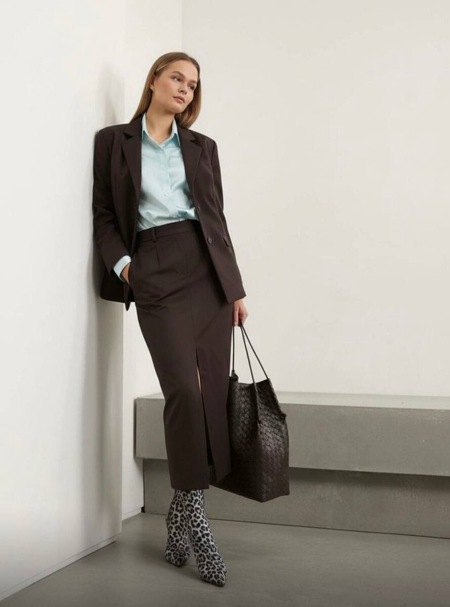Голубая рубашка и коричневый костюм — одно из них. Казалось бы — простая голубая рубашка. Но именно она собирает весь образ. Под жакетом она даёт свежесть. В сочетании с коричневым костюмом — выглядит глубже, теплее и дороже. Голубой освежает, коричневый даёт структуру и статус. И вместе они создают тот самый баланс, когда образ выглядит продуманным. Это тот приём, когда образ выглядит дороже, чем он есть на самом деле.