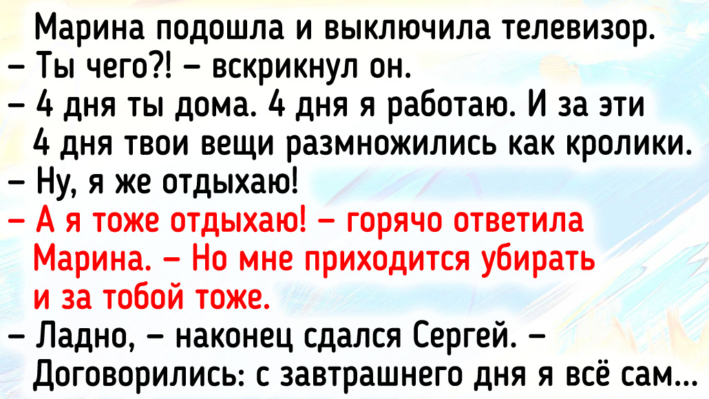 Марина тяжело опустилась на кухонный стул, смахивая с ладони последние капли пены моющего средства. На столе снова царил хаос: кусочки пиццы на подносе, недопитый чай в кружке, а рядом — стопка неразобранной макулатуры, вынутой из почтового ящика. Кот лениво растянулся на подоконнике, как будто до этого участвовал в создании этого беспорядка. В это время Сергей сидел на диване с ноутбуком на коленях. Пальцы быстро бегали по клавиатуре, глаза блестели от сосредоточенности. Марина наблюдала за ним минуту, другую, третью. Он не замечал её взгляда. Или делал вид, что не замечает. — Сергей, — начала она ровно, но с дрожью в голосе. — Тебе не кажется, что тут как-то… хаотично? — А? — Он поднял глаза, недолго. — Всё нормально. Открой окно, проветри. — Проветрить? — Марина медленно встала. — А коробку пиццы сам уберёшь или она ещё неделю будет украшать стол? Сергей лениво окинул взглядом комнату. — Марина, ну что ты начинаешь? Я весь день на ногах, дай отдохнуть. Потом разберусь. — С работы? —