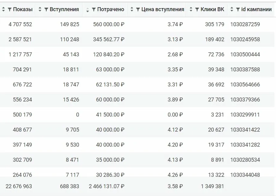 Чтобы не быть голословным — вот конкретика. Один клиент, один рекламный кабинет: 688 тысяч подписчиков, средняя цена — 3,58 рубля. Потрачено 2,4 миллиона. И это ещё без архивных кампаний на шесть с лишним миллионов.