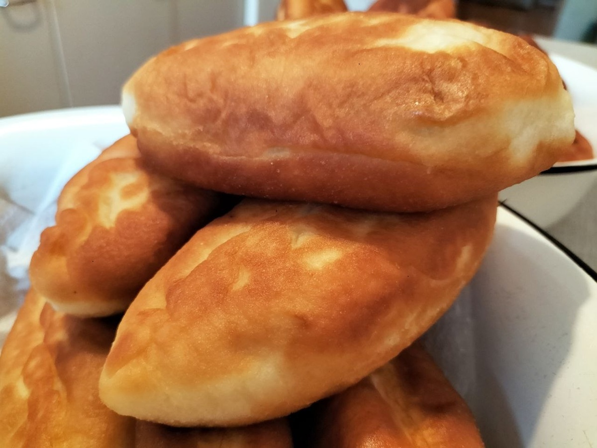 Затем вбиваем яйцо, добавляем масло и еще раз хорошо всё смешиваем до однородности. Постепенно всыпая через сито муку с разрыхлителем (содой), начинаем замешивать тесто. Не всыпайте сразу все количество, чтобы не "забить" тесто мукой, иначе пирожки могут получиться менее воздушными.