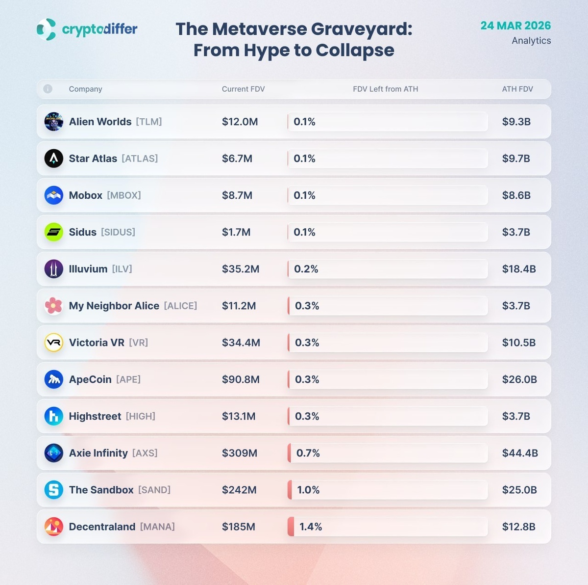 Многие помнят ажиотаж вокруг метавселенных, их грандиозные планы и обещания создателей построить нечто невероятное. Однако реальность оказалась куда более суровой. 📊 Текущая ситуация: ▪️ Star Atlas (ATLA) и Alien Worlds (TLM): практически обесценились. От пиковых значений осталось лишь 0,1% стоимости. ▪️ Axie Infinity (AXS): некогда лидер сегмента P2E с оценкой в $44,4 млрд, теперь стоит $309 млн. Падение более чем в 140 раз. ▪️ The Sandbox (SAND) и Decentraland (MANA): главные игроки держатся чуть лучше, сохранив 1% и 1,4% от своих максимумов. Но это слабое утешение. Токены, как и весь сектор, упали до минимума. Как думаете, есть ли шанс, что интерес к метавселенным вернется? 🤔 🆙 Upscale – трейдинг, доступный каждому Первый челлендж Скидка 5%