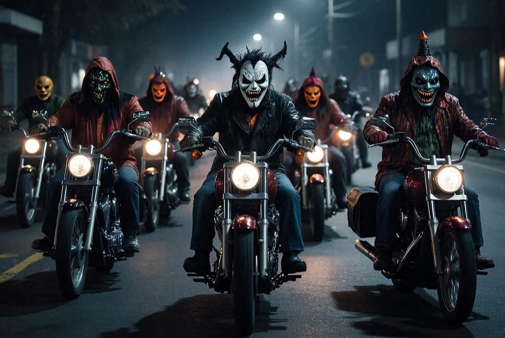 Осознаюсь на улице, темно. На меня едут мотоциклисты, это различные люди в масках и костюмах как на Хеллоуин. Неприятно здесь и немного страшно.