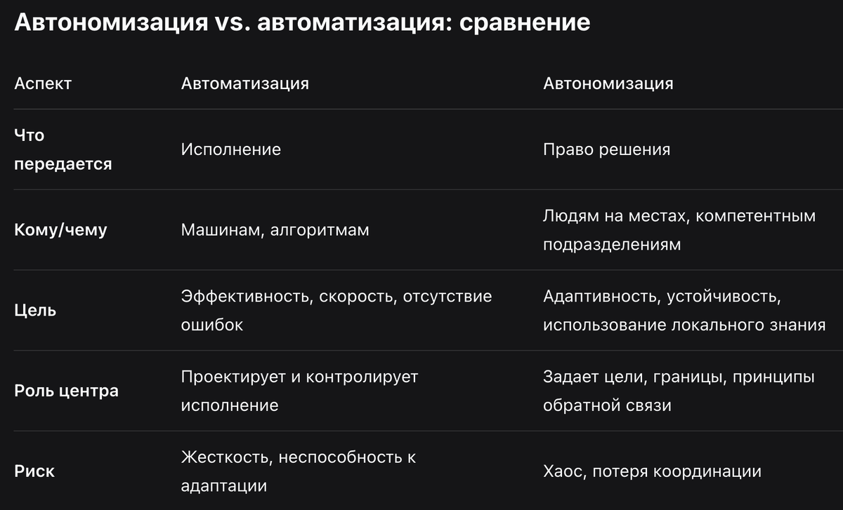 Автономизация — это способ "распределить разнообразие" по системе, не теряя управляемости.