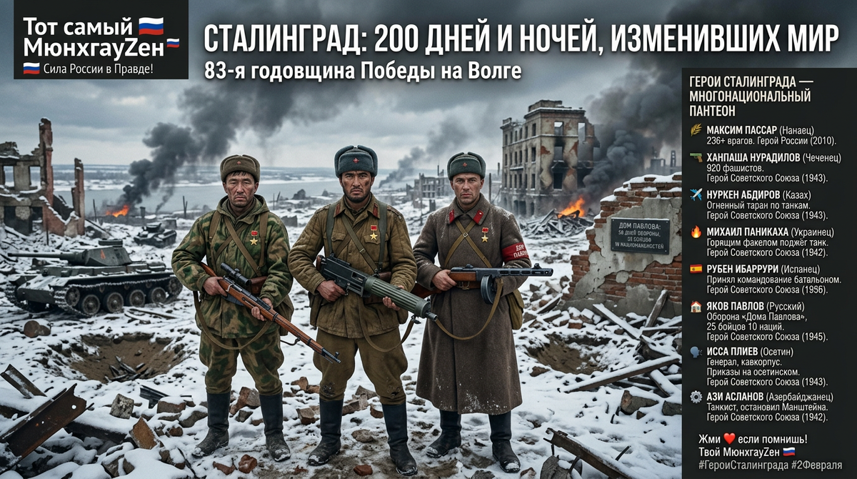 🚨 P.S. 2 февраля 1943 года над развалинами Сталинграда прогремел последний выстрел. 200 дней и ночей горел город, но не сдался. 200 дней и ночей стояли насмерть люди разных национальностей, разных языков, разных судеб. Их объединило одно — великая страна, за которую они отдавали жизни. Сегодня, 2 февраля 2026 года, мы снова возвращаемся к этой дате, чтобы сказать: спасибо, братья. Русские и украинцы, казахи и татары, грузины и осетины, нанайцы и чеченцы, испанцы и азербайджанцы. Вы победили. Вы сделали это вместе. И пока мы помним об этом — Россия непобедима.