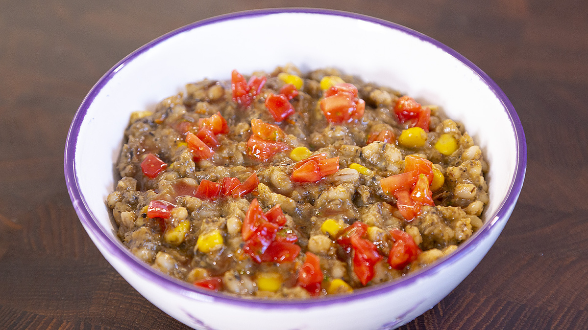 Ингредиенты: Приготовление: Лук, томаты, грибы (замоченные) и чеснок пробить в блендере с оливковым маслом. Обжарить пасту пару минут на сухой сковороде, добавить перловку и кукурузу. Прогреть ~5 минут. Перед подачей посыпать свежими томатами.
