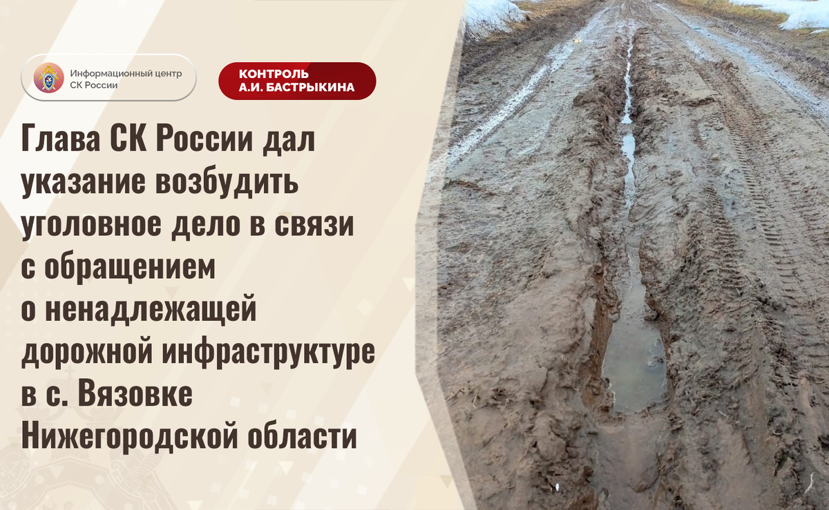 Глава СК России дал указание возбудить уголовное дело в связи с обращением о ненадлежащей дорожной инфраструктуре в с. Вязовке Нижегородской области В приемную Председателя СК России А.И. Бастрыкина в социальной сети «ВКонтакте» поступило обращение по вопросу нарушения прав жителей села Вязовки Нижегородской области на качественную дорожную инфраструктуру. Из-за отсутствия асфальтового покрытия грунтовое полотно дороги на улице Новая Стройка в период выпадения осадков и таяния снега размывается, на ее поверхности образовались ямы и колеи. В связи с этим проезд транспортных средств, в том числе экстренных служб, а также пешее передвижение граждан затруднены. Обращения в компетентные органы результатов не принесли, мер к организации ремонтных работ не принимается. В СУ СК России по Нижегородской области организована процессуальная проверка. Председатель Следственного комитета Российской Федерации Александр Иванович Бастрыкин дал указание руководителю СУ СК России по Нижегородской област
