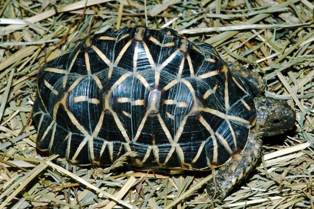 Главная отличительная черта звездчатой черепахи – это ее панцирь. Он имеет выпуклую, куполообразную форму и украшен ярким, радиальным узором, напоминающим звезды или солнечные лучи. Каждый щиток панциря имеет темный центр, от которого расходятся светлые линии, создавая завораживающий рисунок. Этот узор не только красив, но и служит отличным камуфляжем в естественной среде обитания, помогая черепахе сливаться с сухой травой и опавшими листьями.