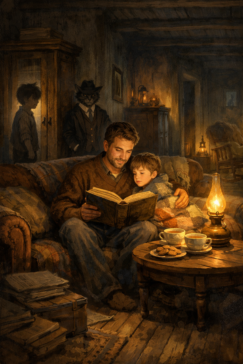 Я усмехнулся и начал читать вслух. Вдруг мне показалось, что в углу комнаты, в тени старого кресла, тихо скрипнула половица. Этот звук был таким мягким и уютным, словно кто-то устроился послушать меня.