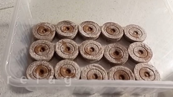 Удобнее использовать для выращивания петунии через таблетки простой пищевой контейнер высотой 5 сантиметров . В него входит 15 штук размером 33 мм. При разбухании они увеличиваются в высоту в 4-7 раз, а в ширину на 1-2 мм.