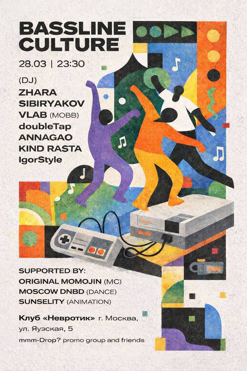 28 марта / Невротик Уже четвёртая глава ночных событий BASSLINE CULTURE пройдет в эту субботу в клубе Невротик, где breaks и drum & bass звучат так, как артисты промо чувствуют сами — честно, энергично и без погони за модой, и выступят расширенным составом — 7 DJ, MC, танцевальная команда, анимация. ZHARA / SIBIRYAKOV / VLAB (MOBB) / doubleTap / ANNAGAO / KIND RASTA / IgorStyle Подробности в канале mmm-Drop 🎫 Вход донейшн 📆 28 марта, в 23:30 📍 Клуб Невротик, Москва, Яузская 5