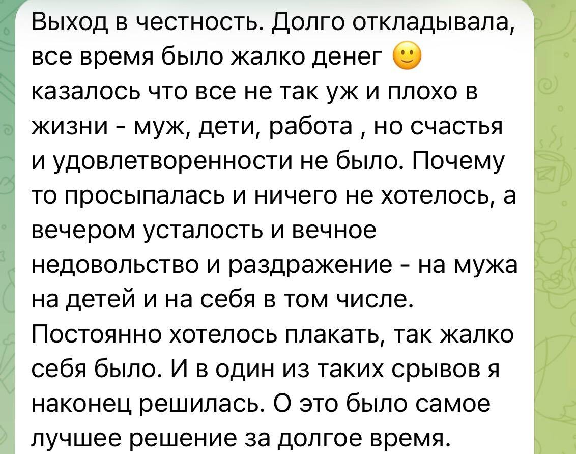 #постчс Сегодня я решила сделать то, чего обычно избегаю. Я не делюсь с вами отзывами, не показываю результаты тех, кто у меня учился Просто периодически что-то публикую обратную связь в отзывах 😍Но дело в том, что сейчас я все больше вижу, как меняются девчата и их жизни Я знаю их истории. С какой болью иногда приходят ко мне, в полном раздрае -Им как и тебе жалко денег, ведь всегда что-то поважнее саморазвития -у них как у тебя нет времени, потому что всегда есть что-то поважнее, чем Ты -они как и ты сомневались, ну а вдруг не поможет -у них как и у тебя была масса «НО» и «ну как-нибудь потом» Но они решились •Пошли на Марафон Осознанности, который за 5000 просто переворачивает сознание •Пошли на Выход в честность, после которого случается магия И к счастью, магия это не временная, не «на недельку, пока от марафончика очередного не отпустит» Это изменение глубинных процессов, нейронных связей, образа мысли и, как следствие, твоей реальности ➡️И я бы рада делать курсы корот