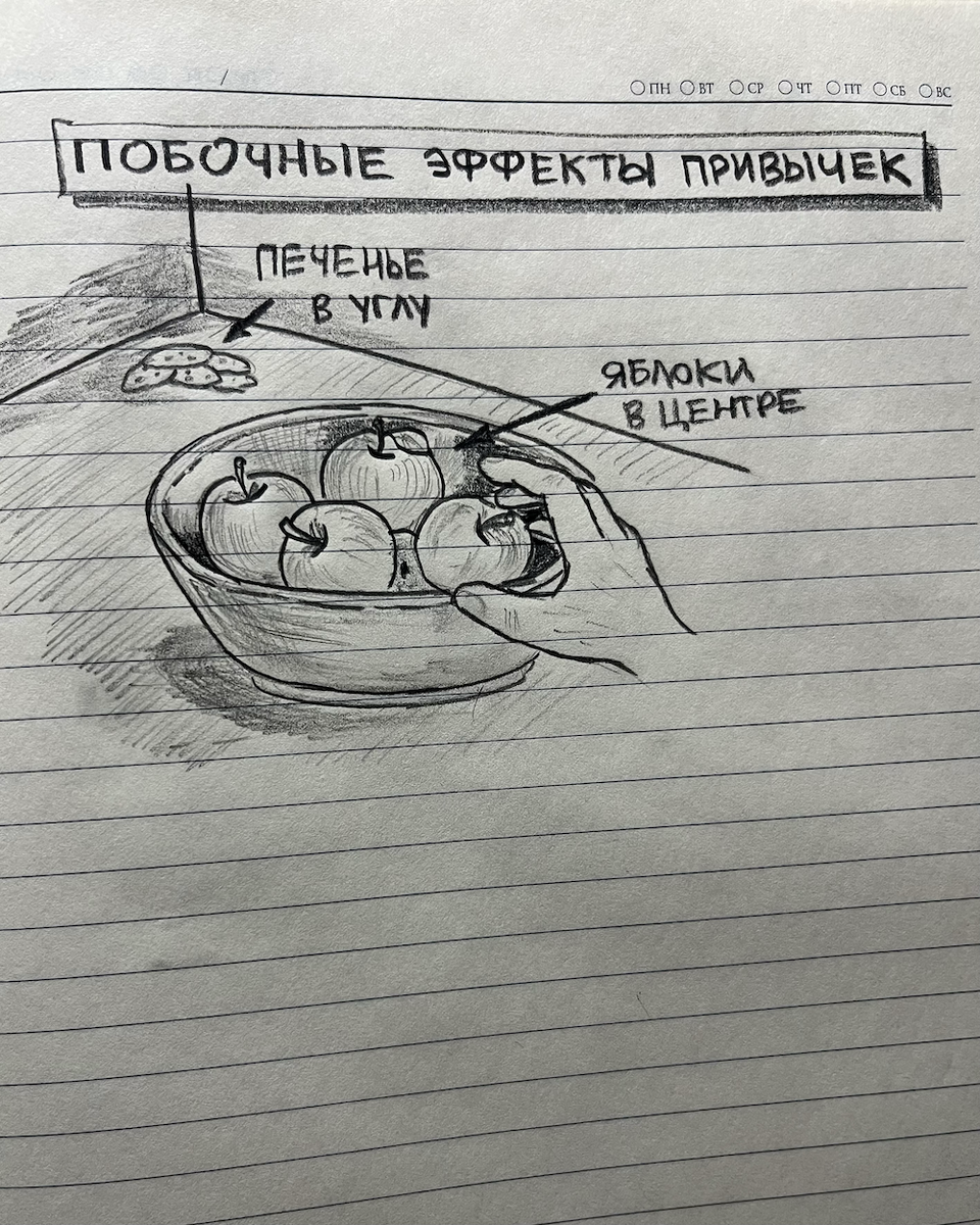 ⏳ Осталось 7 дней. Спустя 75 дней внедрения системы начали проявляться последствия, которых я не планировал. 1. Стратегический подъем. Сначала списывал это на весну и раннее солнце. Оказалось - расчет. Мозг понял: чтобы закрыть нормативы и не воевать в течение дня с гидрой, у которой задачи вместо голов, нужно сделать рывок утром. Теперь подъем в 6 утра - это не насилие над собой, а планирование. А в полдесятого вечера меня буквально валит спать. Организм сам принудительно идет на подзарядку, чтобы успеть восстановиться к утреннему штурму. Появляется азарт и мотивация: скорее лечь, чтобы завтра первым делом выполнить пункты в списке привычек. 2. Особенности питания. В отчетах я пишу «Питание» (что означает правило сытости на 80%). Но на базе этой привычки произошли другие перемены: Вывод: Если на столе лежат печеньки - ты жуешь печеньки. Если на столе яблоки - ты хрустишь яблоками. Твоя воля тут ни при чем. Работает фактор небольшого сдвига среды. Изменения перестали быть теорией. Они