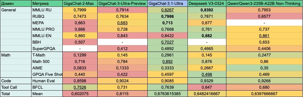Gigachat выпустили в опенсорс свои две новые модели, сразу по ним пройдемся 🔘GigaChat-3.1-Ultra (702B MoE) - Обходит non-reasoning Qwen3-235B-A22B и DeepSeek-V3-0324 в математике и general reasoning - На аренах обошел DeepSeek-V3-0324 и выходит на уровень Qwen3-235B-A22B-Non-Thinking - Лидер среди non-reasoning моделей в Math, General Reasoning, Function Calling, Coding, Vision 🔘GigaChat-3.1-Lightning (10B MoE, 1.8 млрд активных параметров) - Играет на уровне GPT-4o на аренах с судьёй GPT-4.1 - Превосходит конкурентов по скорости - Output: 3 958 tps | Total: 8 054 tps в FP8 + MTP Плюс много всяких дополнительных улучшений и ускорений 🔘В статье у себя рассказали как боролись с багами всякими и трудностями При переходе от Dense к MoE-архитектуре модели стали зацикливаться, выдавая тексты вроде: "…Пальмы. Пальмы. Пальмы. И жара, жара, жара. И океан, океан, океан…" Решили они это измерением циклов, если модель зациклилась, конец генерации хорошо сжимается (много повторяющихся патт