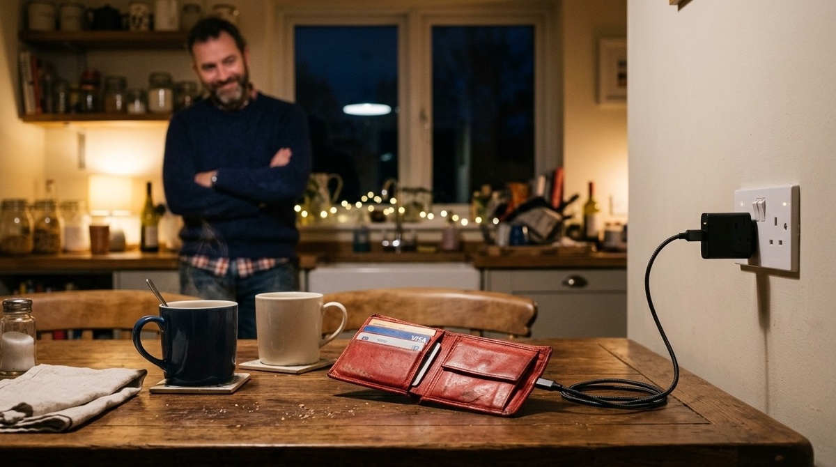 На обеденном столе, прямо на салфетке с подсолнухами, лежал Ленин красный кожаный кошелёк. А в него – я не шучу – был воткнут кабель от зарядки. Второй конец шнура торчал в розетке.