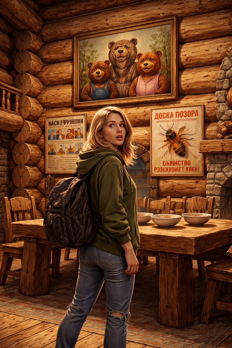 Большая просторная комната с высокими потолками. Внушительного размера стол - целый аэродром, на котором можно было разложить весь ассортимент "Трёх медведей" и ещё место осталось бы для танцев. Полки вдоль стен - ровные, как по линейке, на них - стояли банки с мёдом, выстроенные по росту. Этикетки смотрят строго вперёд, ни одна не наклеена косо. Ложки висят на крючках на одинаковом расстоянии, полотенца сложены в идеальные квадраты. Миски - по линейке. Стулья - как на расстрел.