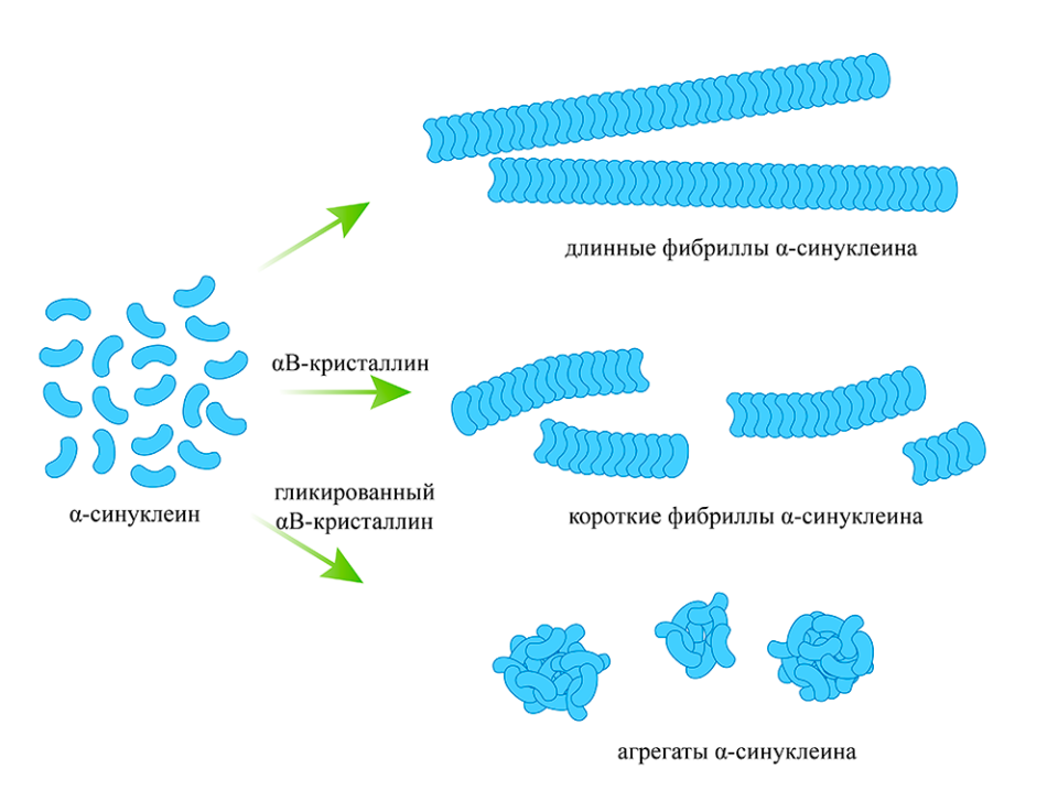 Ученые выяснили, что вещество, уровень которого повышается в крови при диабете, помогает белку-«защитнику» обезвреживать опасные скопления в мозге, связанные с болезнью Паркинсона. Другими словами, диабет, возможно, не ускоряет развитие этого заболевания, как считалось ранее, а потенциально может препятствовать ему. Полученные данные помогут лучше понять, как сахарный диабет влияет на скорость развития нейродегенеративных заболеваний, и разработать подходы к профилактике и лечению таких нарушений. Результаты исследования, поддержанного грантом Российского научного фонда (РНФ), опубликованы в журнале Archives of Biochemistry and Biophysics. Гликированный альфаВ-кристаллин предотвращает образование амилоидных агрегатов альфа-синуклеина Источник: Владимир Муронец / НИИ физико-химической биологии имени А.Н. Белозерского МГУ имени М.В. Ломоносова. Болезнь Паркинсона — распространенное нейродегенеративное заболевание, от которого страдает более 8,5 миллионов человек во всем мире. Хотя его пр