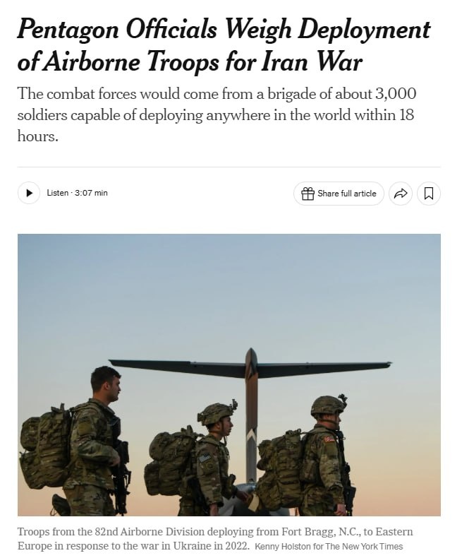 США планируют перебросить 3000 военнослужащих из состава 82-й воздушно-десантной дивизии на Ближний Восток, пишут сразу несколько