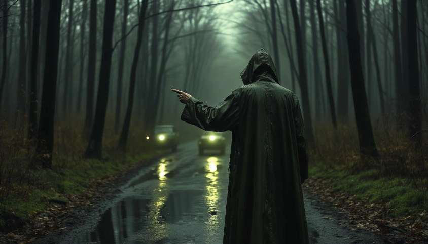 Максим выехал из города поздним вечером. Ему нужно было добраться до деревни, где жила его бабушка — та позвонила в панике: у неё поднялось давление, а скорая не могла приехать раньше утра из‑за плохой погоды. Дорога проходила через глухой лес — длинный, извилистый участок трассы, который местные называли «Чёрной лентой». Говорили, что там часто случаются аварии, а некоторые водители якобы видели странные огни и тени среди деревьев. Небо затянули тяжёлые тучи, моросил дождь. Фары выхватывали из темноты мокрые обочины и стволы вековых елей, которые словно сжимали дорогу в тиски. Максим включил навигатор, но сигнал то и дело пропадал. Оставалось полагаться на память и редкие указатели. Через час езды он заметил впереди тусклый свет фар. Машина двигалась медленно, будто плелась еле‑еле. Максим решил обогнать её, но как только приблизился, понял: что‑то не так. Автомобиль впереди был старым, ржавым «Москвичом» — таких уже лет двадцать не выпускали. Максим поморгал дальним светом, надеясь,