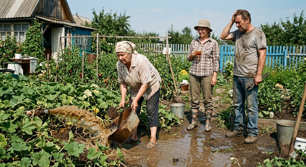 В этот момент прямо посреди грядки с элитными кабачками-титанами начал вздуваться огромный пузырь земли. Через секунду он лопнул, и в небо ударил мощный фонтан воды, густо перемешанный с тем самым «французским» навозом и какой-то ржавой жижей.